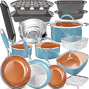 This sky blue wok is suppressed with five layers of 100% free of APEO and PFOA materials. The surface copper ceramic coating ensures non-stick characteristics of it. Four internal layers are made of aluminum alloy, allowing this frying pan to heat evenly and more resistant. Each time you cook with this wok pan, you do not need to worry anything about health ,The superior Ceramic of copper cookware set is ultra-nonstick and scratch resistant that enhances both durability and cooking performance. The whole lot just slides right off the in reality nonstick surface for optimum cooking. Cleans up easily, dishwasher protected (hand wash is really useful)