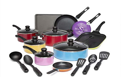 Versatile and convenient, Ecolution’s Easy Clean line of non-stick cookware offers superior performance for your entire cooking needs. This 20 piece cookware set comes equipped with everything needed to make delicious large family meals, gourmet meals and more. The Easy Clean non-stick pots and pans set features aluminum construction for durable cookware that heats evenly. The non-stick coating allows food to easily slide around and out of the cookware, making cooking easy and clean up a breeze. The smooth non-stick coating is made without PFOA, so you’ll cook with confidence for your family and friends. The cookware is all dishwasher secure, so you’ll let your dishwasher do the dirty work. Use the included bamboo tools, secure for use on non-stick cooking surfaces, to stir, flip and serve your culinary creations.