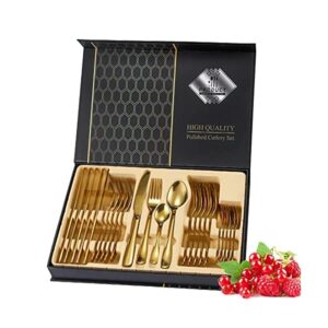 The 24-piece tableware set includes: 6 table knives, 6 table spoons, 6 table forks, and 6 coffee spoons, which can meet the needs of a family of 6 people. Using high-quality materials: made of 304 stainless steel, thickened material, comfortable and thick to hold, good hand feeling, and easy to clean ,packed in exquisite gift boxes, which can be very suitable for gifts and are great gifts for your friends and family in the new apartment very suitable for day by day use, parties, camping, restaurants, hotels, weddings, and the like., in order that you, your friends and family have a pleasant dining experience.