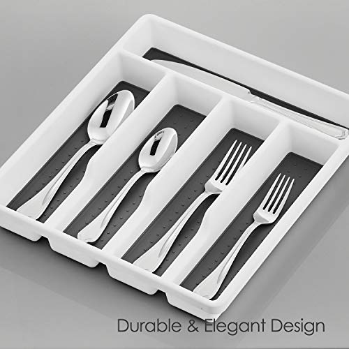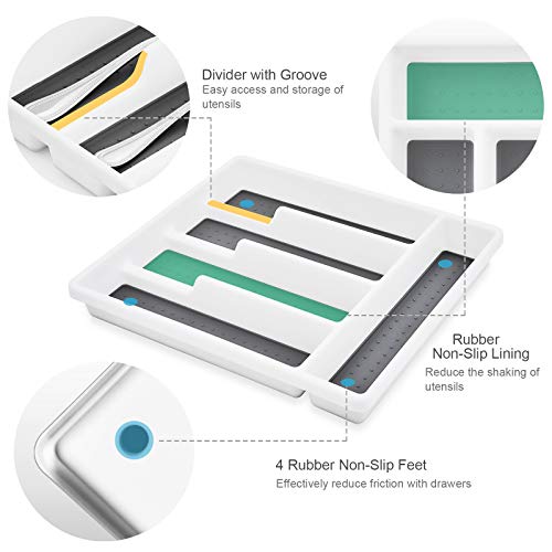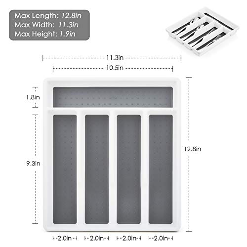 DRAWER ORGANIZER – Made of prime quality durable plastic, withstand normal wear for many years, Measures 12.8" x 11.3" x 1.9"(L x W x H), fits most drawers, 5 compartments provide suitable storage capacity, Rubber non-slip lining and rubber non-slip feet can better give protection to your cutlery and drawers