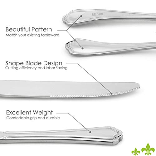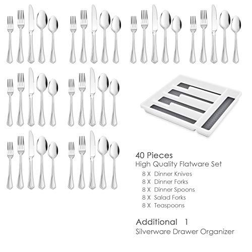40 PIECES PLUS ONE ORGANICER – This set includes 8 of each: dinner knife, dinner fork, dinner spoon, teaspoon and salad fork with beautiful scalloped edges, Additional one drawer organizer, provide storage for your silverware and give protection to it from damage, The prime quality and elegant appearance make it a great gift choice