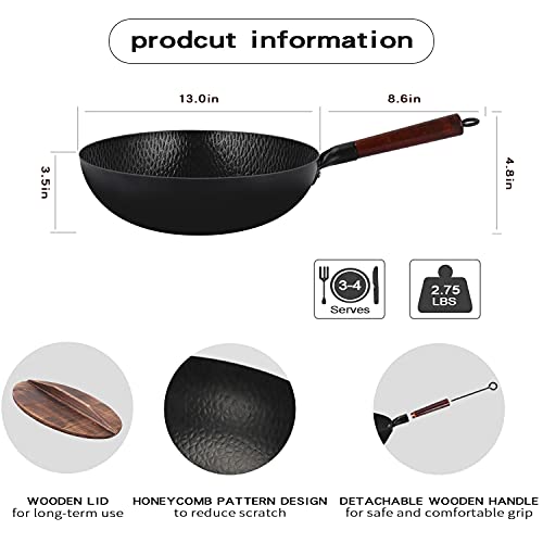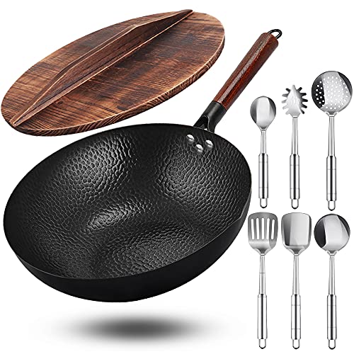BABYLTRL Wok Pan – 12.8″ Woks and Stir Fry Pans, Carbon Steel Wok with Wooden Handle and Lid, 6 Cookware Accessories, Flat Bottom Pan Suits for All Stoves