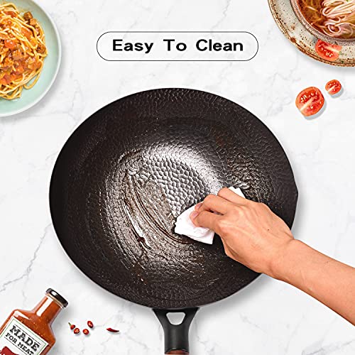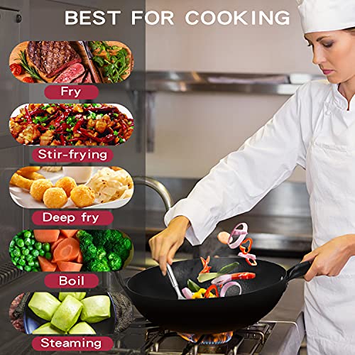 【DURABLE WOK PAN】 Compared with cast iron pans and stainless steel pans, carbon steel wok are extremely fast in heating speed and distributing heat evenly, which means that it can reduce the loss of nutrition when cooking, also light in weight to lift, enabling you to toss food around easily like a a true master chef even as cooking, help make healthy food easier, faster and more efficient
