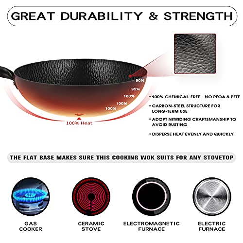 【FOR ALL HEAT SOURCE】Wok is crafted out of 100% carbon steel, the wok pan has been tested thoroughly to be sure that it works perfectly on all heat sources, like electric stoves, induction stoves, gas ranges, ceramic stove and other direct heat sources. The flat base makes sure it sits securely on any stovetop
