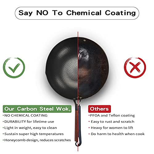 【SAFE WOK, HEALTHY DIET】 Featuring with NO-CHEMICAL COATING and honeycomb design, no worry about toxic substances and coatings falling off. The honeycomb construction is special designed to reduces scratches and maintains the beauty of the wok, besides, we adopt nitriding craftsmanship to avoid rusting. Wok with lid can be used in various cooking methods, like pan-frying, braising, boiling, steaming, deep-frying and so on