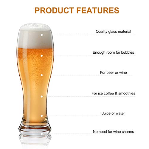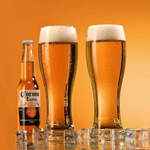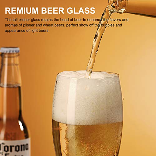REMIUM TALL BEER GLASS – The pilsner glass retains the head of beer to enhance the flavors and aromas of pilsner and wheat beers. perfect show off the bubbles and appearance of light beers. Thick base prevents tipping.