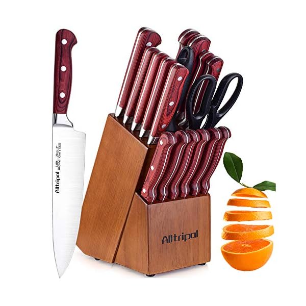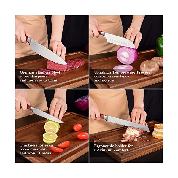 ★【Premium German Stainless Steel】Our knife set is manufactured from high-quality German high carbon stainless steel X50Cr15, it’s sturdiness ensures the functionality of our knife for a very long time. The steel consists of 0.5% carbon and 15% chrome for adding the strength and durability of the blade; more durable, wear resistant, sharp and no rust.
