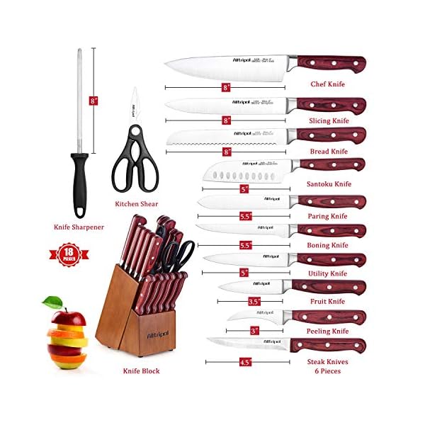 ★【Perfect Knife Set For Daily Cutting】18 pieces German stainless steel knife set meet all of the need of kitchen tools: 1xchef’s knife; 1xbread knife; 1xslicing knife; 1xsantoku knife; 1xutility knife; 1xfruit knife; 1xpeeling knife; 1xboning knife; 1xparing knife; 1xknife sharpener; 1xwood knife block; 1xkitchen scissor; 6 steak knives for a dinner party.