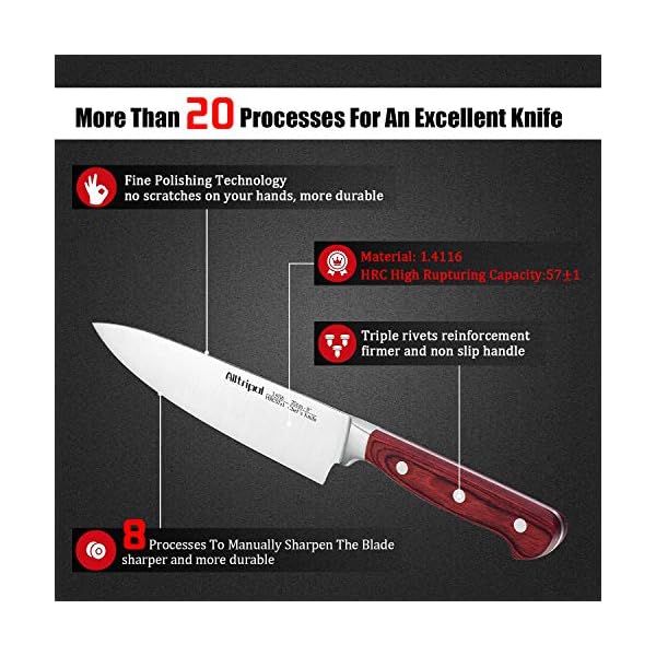 ★【Ultra-Sharp Blade And No Easy Dull 】The sharpness of the knife is the most important point for the cutting. Our knives is hand polished by craftsman with decades of experience, and the professional German high carbon stainless steel X50Cr15 ensure the long lasting sharpness of our knife. Meanwhile, this knife set comes with a sharpener, you’ll sharpen the knife frequently to keep the sharpness.