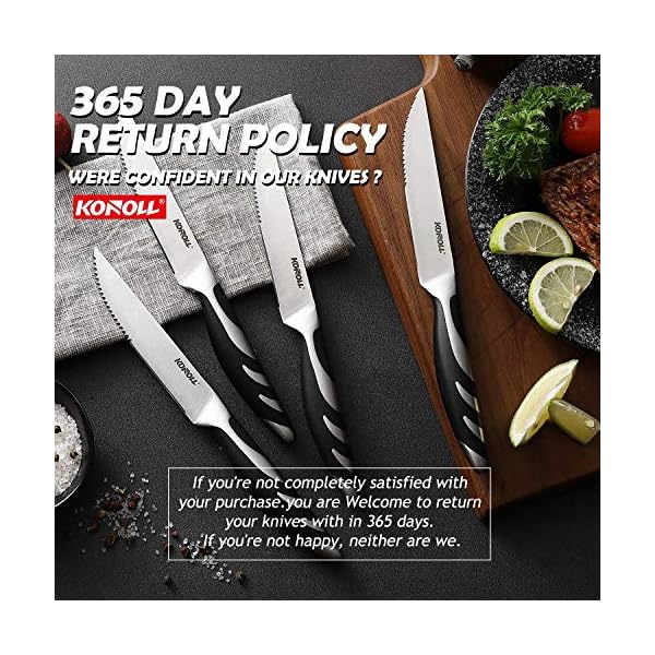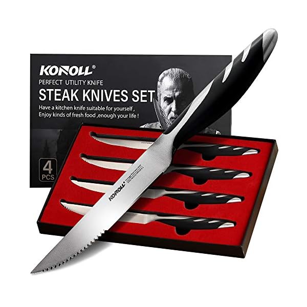 ·DON’T KNOW WHAT TO GIVE AS A GIFT? – The best steak knives are ones given as gifts. This steak knife set is perfect for as a thanksgiving gift, housewarming gift, father’s day gift, anniversary gift, or retirement gift. If you’re on the lookout for a stylish and practical way to give back to your friends and family, then the KONOLL serrated steak knives set of 4 8 or 12 is your prime choice! The steak knifes set comes in a luxurious gift box, so you're going to look great!