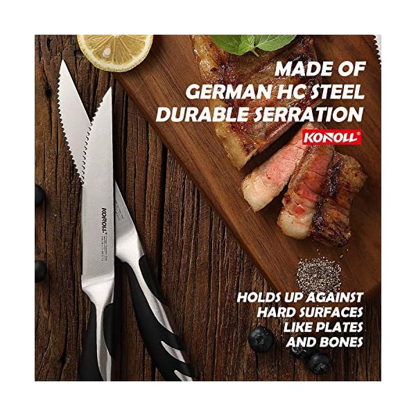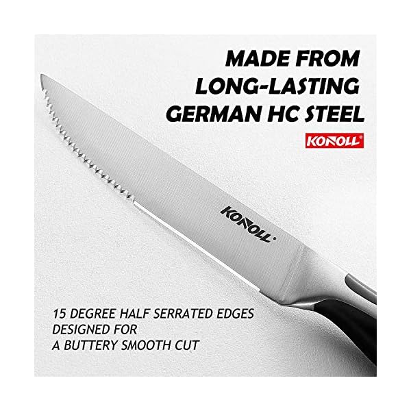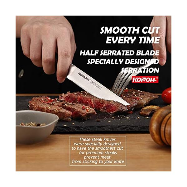 KONOLL steak knives made of high-quality German stainless steel, which Sharp and Durable , resists rust, corrosion, and discoloration.