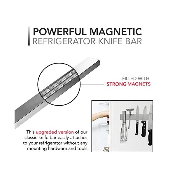 The Modern Innovations 16” Refrigerator Knife Bar makes organizing your kitchen & home a breeze! This updated version of our classic knife bar attaches directly to your fridge- no tools required & materials required! Covered in elegant, satin-finished, high grade stainless steel, our knife block has a fully magnetic surface powered by strong magnets with a sophisticated look that effortlessly compliments your home décor.