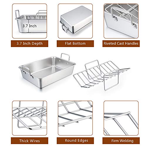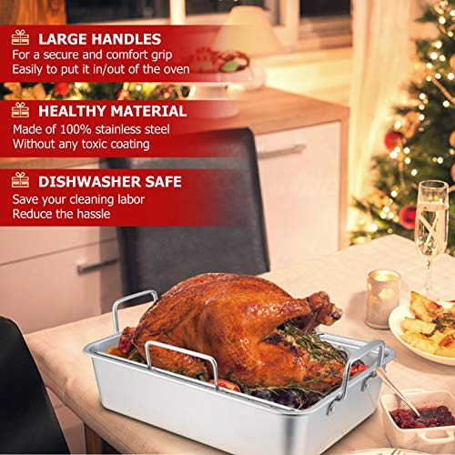 【HEALTHY】Both the roasting pan and rack are made of 100% pure stainless steel without any toxic coatings, Great replacement to unhealthy aluminum roaster pan and rack, Heavy gauge and well construction for holding heavier food, Durable for a long-lasting life