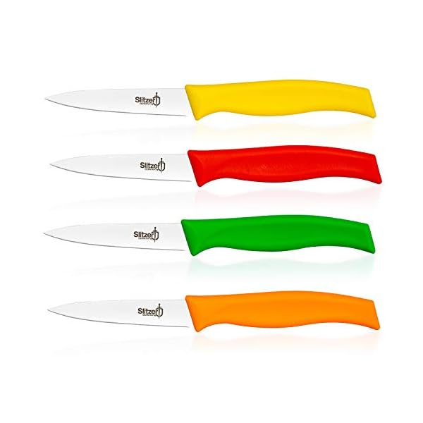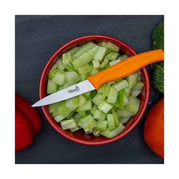 Our paring knife set includes 4 3.5” paring knifes so you at all times have one at hand. Make food preparation easier with paring knives that do the job. With our razor-sharp blades, you’ll have the ability to cut fruits, veggies, or small meats with precision. Made of reliable German stainless steel and built to last, the blades of our kitchen knife set will cut food effortlessly, with only minimal force for your part. Easily keep an eye on our knives with their pointed blades that allow for tight and targeted coring or paring. Peeling that fruit or deveining that shrimp might be a breeze. With ergonomically shaped hilts, you’ll have a strong grip of the knives at the same time as doing food prep. Keep away from accidents within the kitchen with knife handles that won’t slip.
