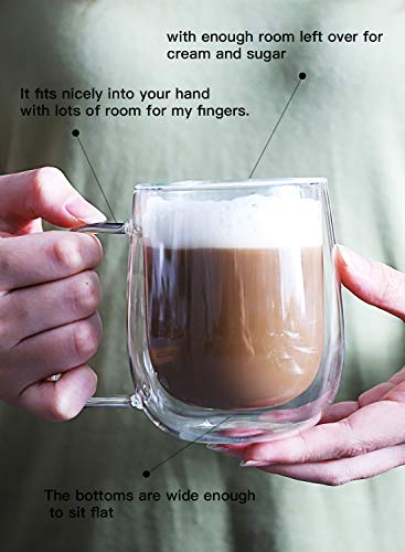 DOUBLE WALLED DESIGN – Double-walled, hand blown glass insulation keeps your coffee hot and your hand cool. No sweat! Also works great for your favorite icy cold drink. The comfortable, wide opening and thick handle is easy to grasp and it fits really nicely into your hand with lots of room for your fingers. The bottoms of these mugs are wide enough to sit flat and wouldn’t wobble on the table.
