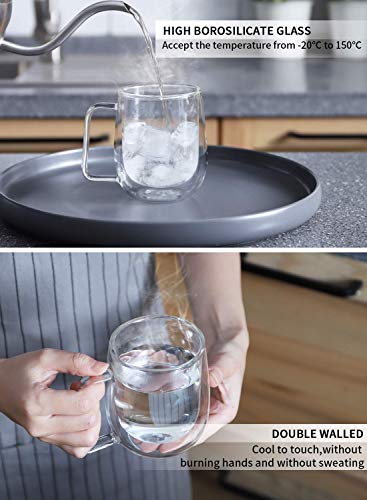 HAND BLOWN BOROSILICATE GLASS – Borosilicate glass is well known as the purest and safest material to contact with water. It has super chemistry stability: acid & alkali resistant, and anti-corrosion ability. Therefore, no want to worry any harmful and toxic substance is released when drinking. Unlike other crystal glassware which by definition will have to contain at least 20% lead, this double-wall borosilicate glass coffee mugs are 100% lead free.