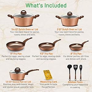 Dishwasher Protected: Easy to clean and dishwasher Protected cookware set; Nonstick interior and exterior for low fat cooking and easy cleaning