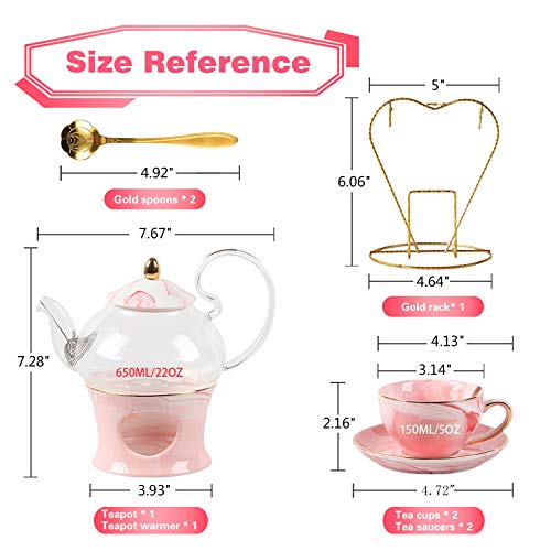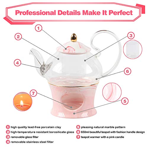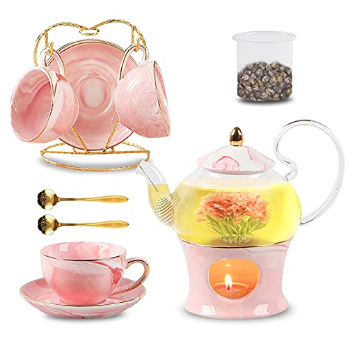 Professional Details Make Superior Quality: TETWIN tea cups and saucers is specially crafted with delightful cherry blossom pink color and natural marble pattern. Made from heat resistant borosilicate glass, the teapot with removable glass filter is Secure to use on teapot warmer. Also the grip is comfortable and sturdy thanks to the elegant handle design.